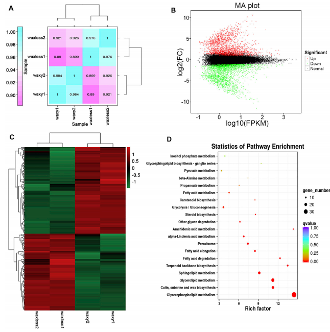 此外,我們注釋了3659個DGE的脂質(zhì)功能,篩選了343個DGE,并使用KEGG富集分析對其進(jìn)行富集(圖2C,D)。研究發(fā)現(xiàn),這些基因主要集中在甘油磷脂代謝、角質(zhì)層、亞油酸和蠟的生物合成、甘油脂代謝、鞘脂代謝、萜類主干生物合成、脂肪酸降解和脂肪酸伸長途徑中,這與該研究中控制小麥葉片光澤表型的主要脂質(zhì)組分一致。