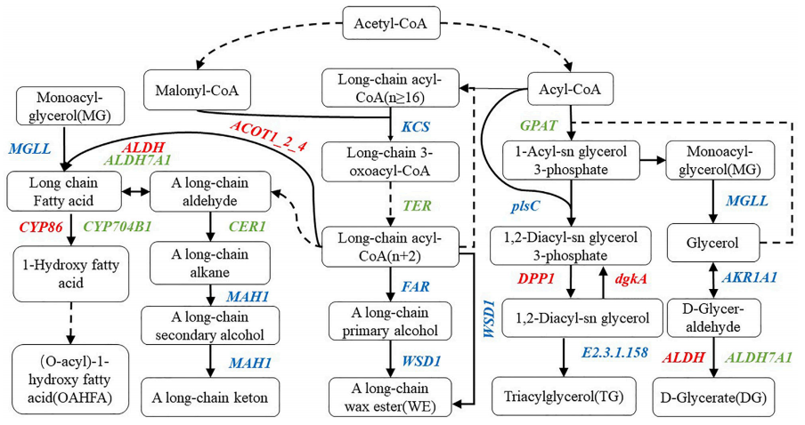 在OAHFA合成過程中,?;o酶A硫代酯酶1/2/4基因(ACOT1_2_4)的上調(diào)表達(dá)促進(jìn)長鏈脂肪酸的合成,而酰基甘油脂肪酶基因(MGLL)的表達(dá)水平在單?;视娃D(zhuǎn)化為長鏈脂肪酸的過程中上調(diào)和下調(diào)。醛脫氫酶家族7個成員A1基因(ALDH7A1)表達(dá)下調(diào)抑制了A長鏈醛與長鏈脂肪酸之間的過渡,醛脫氫酶基因(ALDH)則上調(diào)了A長鏈醛與長鏈脂肪酸之間的過渡。在長鏈脂肪酸轉(zhuǎn)化為ω-羥基脂肪酸的過程中,長鏈脂肪酸ω-單加氧酶基因(CYP704B1)的表達(dá)下調(diào),而突變無蠟脂肪酸ω-羥化酶基因(CYP86)的表達(dá)上調(diào)。甘油-3磷酸?;D(zhuǎn)移酶基因(GPAT)和ALDH7A1在DG、MG和TG的甘油酯代謝過程中下調(diào)。在無蠟情況下,葡萄糖的表達(dá)下調(diào)抑制了1-?;?sn甘油3-磷酸的合成,從而減少了鎂的合成。ALDH7A1在低蠟突變體中的下調(diào)表達(dá)降低了DG的合成。上調(diào)基因?yàn)锳LDH、二酰甘油二磷酸磷酸酶基因(DPP1)和二酰甘油激酶基因(dgkA),而1-?;?SN-甘油-3-磷酸酰基轉(zhuǎn)移酶基因(plsC)的表達(dá)為磷脂:酰甘油?;D(zhuǎn)移酶基因(E2.3.1.158)、MGLL和酒精脫氫酶基因(AKR1AI)均上調(diào)和下調(diào)。這些基因共同作用降低低蠟突變無蠟細(xì)胞中TG的含量。