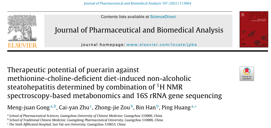 2. Gong M, Zhu C, Zou Z, et al. Therapeutic potential of puerarin against methionine-choline-deficient diet-induced non-alcoholic steatohepatitis determined by combination of 1H NMR spectroscopy-based metabonomics and 16S rRNA gene sequencing[J]. Journal of Pharmaceutical and Biomedical Analysis, 2021, 197: 113964.