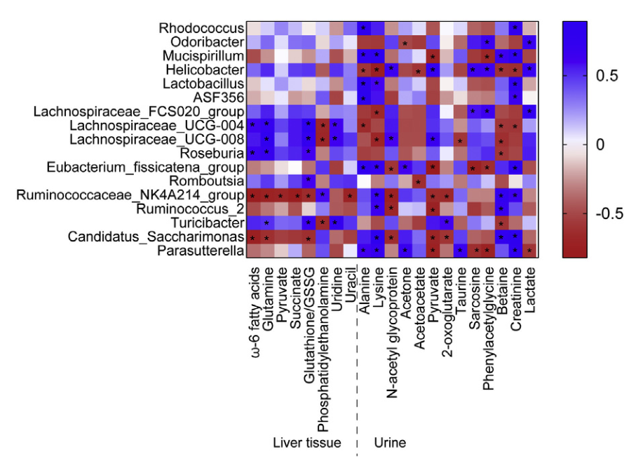 圖2.對(duì)照組和模型組在屬水平上受干擾的腸道微菌群和改變的肝和尿代謝物之間的相關(guān)性。