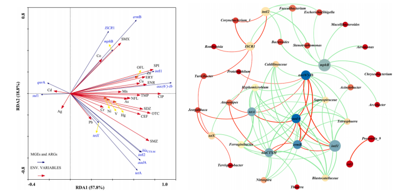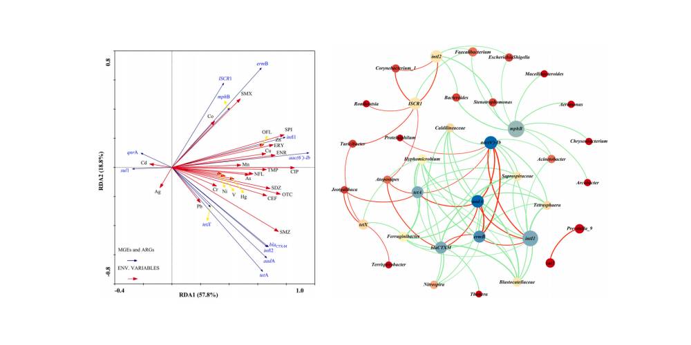抗生素耐藥性是影響生態(tài)系統(tǒng)健康和公共衛(wèi)生的一個(gè)日益嚴(yán)重的問(wèn)題。該研究在中國(guó)新鄉(xiāng)16個(gè)采樣點(diǎn)調(diào)查了9個(gè)耐藥基因(ARGs)和3個(gè)移動(dòng)遺傳元件(MGEs)及其與抗生素、重金屬和微生物群的關(guān)系。醫(yī)院排出物中氟喹諾酮類(lèi)(fluoroquinolones)含量最高,動(dòng)物糞便中土霉素(oxytetracycline)含量最高。動(dòng)物糞便中鋅和銅含量最高,可能影響intI1和aac(6’)-Ib基因的擴(kuò)散。氨基糖苷類(lèi)和磺胺類(lèi)耐藥基因(aac(6 ‘)-Ib、aadA和sul1)是該地區(qū)主要ARGs。此外,除sul1基因外,動(dòng)物糞便中ARGs和MGEs的檢出量均高于醫(yī)院污水。另一方面,污水處理廠(MWWTPs)中抗生素(29.76-100%)、重金屬(31.25-100%)和ARGs(1-3個(gè)數(shù)量級(jí))的不完全去除導(dǎo)致這些污染物在下游河流中積累。網(wǎng)絡(luò)分析表明,ARG的潛在宿主(Jeotgalibaca、Atopostipes、Corynebacterium_1等)在動(dòng)物糞便中比在醫(yī)院污水中更占優(yōu)勢(shì),表明與醫(yī)院污水相比,ARG在動(dòng)物糞便中的轉(zhuǎn)移潛力更高。這些結(jié)果為抗生素、重金屬、ARGs和微生物從人類(lèi)和動(dòng)物源通過(guò)MWWTP排放和施肥向接收環(huán)境的不同遷移和傳播途徑提供了有用的見(jiàn)解。