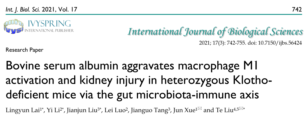 3.Lai L, Li Y, Liu J, et al. Bovine serum albumin aggravates macrophage M1 activation and kidney injury in heterozygous Klotho-deficient mice via the gut microbiota-immune axis[J]. International journal of biological sciences, 2021, 17(3): 742.