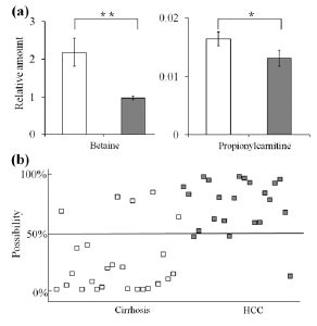 內(nèi)部驗(yàn)證通過(guò)之后對(duì)其他來(lái)源的樣本進(jìn)行外部靶向檢測(cè),進(jìn)一步用來(lái)排除假陽(yáng)性和評(píng)價(jià)標(biāo)志物的診斷能力。對(duì)47例(22例肝炎、22例肝癌)血液樣本中的甜菜堿、丙酰肉堿進(jìn)行靶向代謝組學(xué)檢測(cè),結(jié)果表明甜菜堿、丙酰肉堿均在肝癌患者中呈顯著的下調(diào),與之前的非靶測(cè)試測(cè)試結(jié)果一致,排除了假陽(yáng)性。甜菜堿、丙酰肉堿組合進(jìn)行疾病診斷準(zhǔn)確率可以達(dá)到80%以上,具有臨床應(yīng)用的價(jià)值。