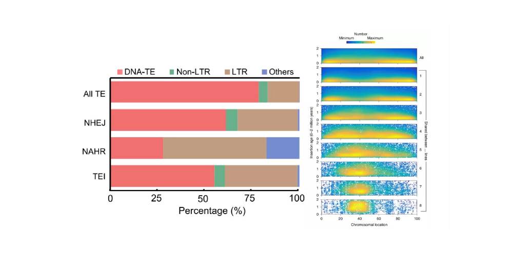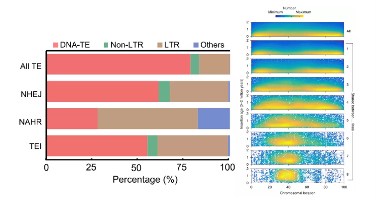 水稻中TEs,尤其是LTRs促進(jìn)非等位同源重組(Qin P et al.,Cell.2021);玉米泛基因組中隨著個(gè)體的增加,LTR插入呈現(xiàn)向中心富集,并與插入時(shí)間的增加相關(guān)。