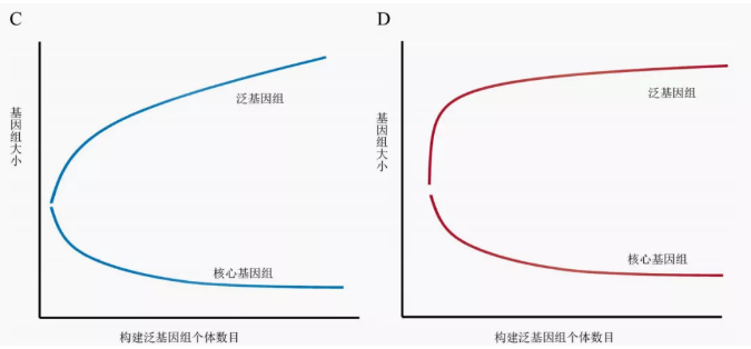 廣義的泛基因組是指獲取該物種全部遺傳信息,構(gòu)建一個(gè)非冗余的集合體。由于個(gè)體間的差異,在構(gòu)建泛基因組的時(shí)候會在參考基因組的基礎(chǔ)上,不斷引入新的特異性序列。因此,統(tǒng)計(jì)結(jié)果可發(fā)現(xiàn)整個(gè)泛基因組的大小隨著個(gè)體數(shù)量的增加而增加,核心基因組(幾乎存在與全部個(gè)體基因組中)的大小隨著個(gè)體數(shù)量的增加而減?。ㄈ鐖D1)。