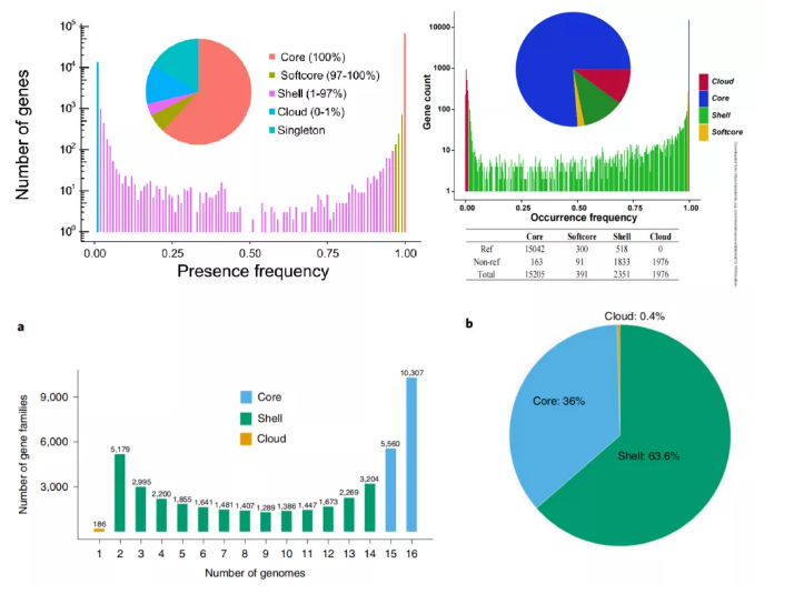 隨著基因組數(shù)量的增加,核心基因的識別將嚴(yán)重受到denovo中組裝錯(cuò)誤的影響。為了糾正這種錯(cuò)誤,一些科研工作者將泛基因組進(jìn)一步細(xì)分:在所有基因組的為核心基因(core),在幾乎所有品系中發(fā)現(xiàn)的為soft-core,在比soft-core少但不止幾個(gè)品系的品系中發(fā)現(xiàn)的shell,以及在只有幾個(gè)品系中發(fā)現(xiàn)的為cloud。具體的分類比例與樣品數(shù)量間的關(guān)系并不固定,目的均是為了對基因進(jìn)行分組,以便進(jìn)行可靠的比較(圖3)。而這些分組的基因頻率呈現(xiàn)不對稱的首尾高中間低的分布形式,充分展示了不同類別基因型的占比情況。