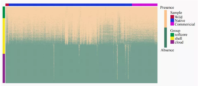 除此之外,根據(jù)core、dispensable等各組分聚類結(jié)果構(gòu)建基因家族的存在與缺失分布熱圖,進(jìn)一步了解不同材料中的差異情況。同時(shí)可結(jié)合不同來源or不同表型等特征充分挖掘其基因型的多態(tài)性。