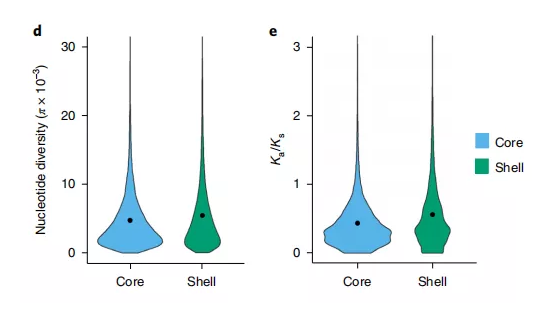 眾多研究表明,非核心基因比核心基因的可變性更強(qiáng);與核心基因集相比,非核心基因集中的非同義突變比同義突變的比率要高。因此通過同義與非同義突變(ka/ks)可以用來檢測非核心基因集中基因是否受到選擇作用。
