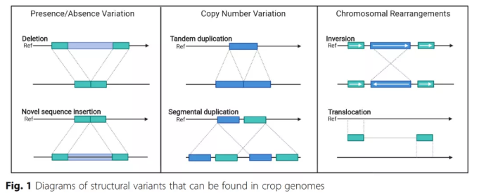 結(jié)構(gòu)變異是泛基因組的重點(diǎn)研究對象,這些變異信息為物種的人為選擇及自然選擇提供原始的材料。了解變異產(chǎn)生的過程,探究不同材料的變異程度并利用有利的變異對維持并提高物種生產(chǎn)力至關(guān)重要,有助于解析物種表型和農(nóng)藝性狀的多樣性。泛基因組研究,為更好地了解SV在動植物馴化中的作用提供了基礎(chǔ)。主要研究的變異類型為:SNP(Single nucleotide polymorphism),即單核苷酸多態(tài)性變異,主要指在基因組水平上由單個(gè)核苷酸的變異所引起的DNA序列多態(tài)性,這種變異可由單個(gè)堿基的轉(zhuǎn)換(transition)或顛換(transversion)所引起。InDel(Insertion-Deletion),指的是在基因組的某個(gè)位置上所發(fā)生的小片段序列的插入或者刪除,其長度通常在在 2 bp-50 bp 之間。SV(Structure Variantions),即基因組結(jié)構(gòu)性變異,通常指的是基因組上大長度的序列變化和位置關(guān)系變化,有豐富的變異類型,包括長度在50bp以上的長片段染色體倒位、染色體易位、重復(fù)、存在/缺失(PAV)、拷貝數(shù)變異(CNV)。