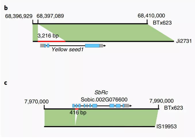 例如高粱泛基因組研究發(fā)現(xiàn),相對于參考基因組,其它高粱個(gè)體基因組中有429~1118個(gè)基因存在拷貝數(shù)變異(CNV)。功能注釋顯示這些CNV基因豐富了防御反應(yīng)、信號轉(zhuǎn)導(dǎo)和細(xì)胞蛋白分解代謝等生物學(xué)過程。并且不同高粱個(gè)體基因組上存在大量的存在缺失變異(PAV),有2514個(gè)基因受PAV嚴(yán)重影響,這些基因富集于與生物和非生物脅迫相關(guān)的生物過程,而抗病基因在這組基因中顯著富集。進(jìn)一步研究發(fā)現(xiàn)Yellow seed1、SbRc的PAV影響到高粱籽粒顏色變化(圖9)
