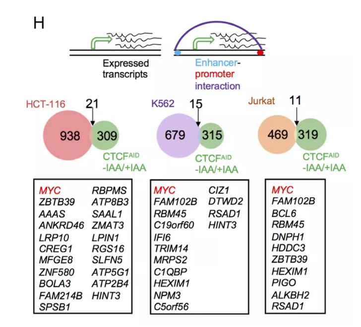 CTCF基因啟動子的染色質(zhì)可及性在CTCF耗竭時也有所增加(圖3D),這一點通過定量PCR (Q-PCR)進(jìn)一步得到驗證(圖3E)。這些數(shù)據(jù)表明CTCF可以抑制自身以保持最*表達(dá)水平。對于CTCF耗竭后被下調(diào)的基因,如MYC,并沒有在啟動子區(qū)域檢測到有統(tǒng)計學(xué)意義的染色質(zhì)可及性變化。因此,當(dāng)啟動子區(qū)域保持開放時,遠(yuǎn)端增強子區(qū)域的染色質(zhì)景觀變得更難以接近,再加上CTCF耗竭,可能在控制能調(diào)控MYC轉(zhuǎn)錄的遠(yuǎn)端增強子-啟動子loop環(huán)的形成中發(fā)揮作用。