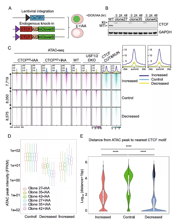 前期研究已經(jīng)通過將雙等位基因miniAID-mClover3標(biāo)簽導(dǎo)入人的內(nèi)源性CTCF位點,并產(chǎn)生了三個CTCFAID細(xì)胞的克隆。在強力霉素和生長素(IAA)處理下,強制表達(dá)與Skp1/Culin/F-box (SCF)泛素連接酶組分連接的OsTIR1,快速降解CTCF融合蛋白(圖1A)。當(dāng)強力霉素和IAA完全從培養(yǎng)基中洗脫后,這種降解是可逆的。通過對三個單細(xì)胞來源的克隆進(jìn)行IAA處理24小時的免疫印跡實驗,證實了CTCF能夠有效降解(圖1B),類似于之前在48h處理條件下的研究結(jié)果。