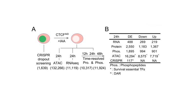 CCCTC-結(jié)合因子(CTCF)是一種高度保守的含鋅指轉(zhuǎn)錄因子,被稱為“基因組編織大師”。它是研究最廣泛的三維(3D)染色質(zhì)結(jié)構(gòu)調(diào)控因子。研究發(fā)現(xiàn)在CTCF急性衰竭細(xì)胞模型和其他基因敲除模型中,CTCF在全基因組TAD和TAD內(nèi)部loop環(huán)的形成中是不可或缺的。為了更好地理解CTCF結(jié)合占用率如何促進(jìn)轉(zhuǎn)錄調(diào)控,本文系統(tǒng)地進(jìn)行了多組學(xué)研究,特別關(guān)注染色質(zhì)可及性。通過系統(tǒng)整合了ATAC-seq、RNA-seq, WGBS, Hi-C, Cut&Run和CRISPR-Cas9基因篩選技術(shù),以及深度蛋白質(zhì)組學(xué)和磷酸化蛋白質(zhì)組學(xué)分析,用以研究CTCF蛋白急性耗竭對細(xì)胞的影響。