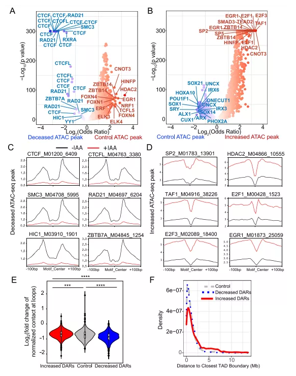 接下來分析這些DARs與它們最近的CTCF motif之間的物理距離。結(jié)果表明,可及性減弱的DARs更接近于最近的CTCF motifs。相比之下,可及性增強的DARs與CTCF motif的距離顯著高于可及性減弱的DARs,但顯著低于對照組(圖1E)。