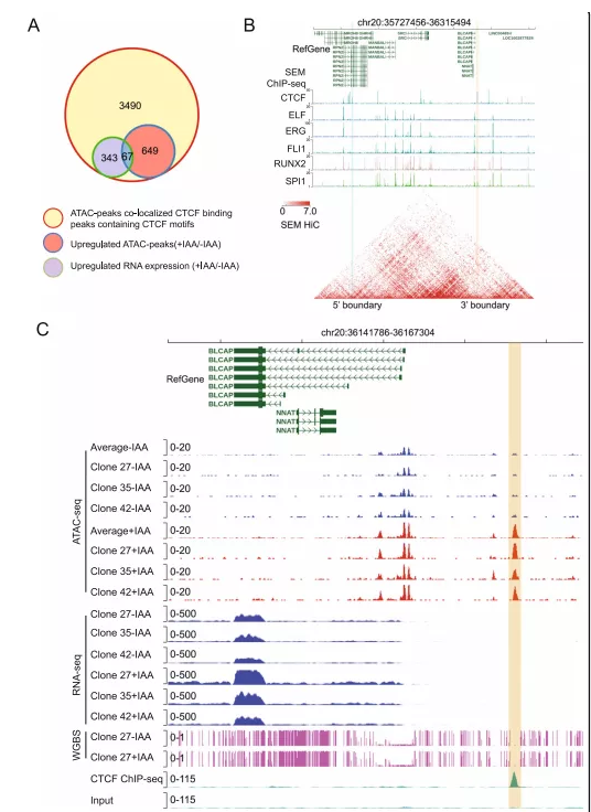 本文通過綜合分析建立了一個框架來識別假定的CTCF介導(dǎo)的絕緣子元件。將ATAC-seq結(jié)果中的3490個峰和有CTCF結(jié)合的峰取交集,共有716個增強的ATAC-seq峰。接下來,將它們與RNA-seq結(jié)果中上調(diào)的基因進(jìn)行比對,判斷TSSs是否位于距離DARs區(qū)域2-50 kb的范圍。綜上所述,有67個基因符合這些標(biāo)準(zhǔn)(圖(Fig 4A)。這67個基因中有20個基因的附近有染色質(zhì)loop環(huán)。例如,在BLCAP基因上游約7 kb處觀察到一個假定的抑制性CTCF結(jié)合峰,該峰位于Hi-C數(shù)據(jù)所示的染色質(zhì)絕緣loop環(huán)中(圖4B )。在未經(jīng)過IAA處理的對照CTCFAID細(xì)胞中,CTCF與該motif結(jié)合導(dǎo)致染色質(zhì)可及性受到抑制,這在ATAC-seq數(shù)據(jù)中信號的缺失很明顯。然而,在急性CTCF耗竭時,ATAC-seq峰值信號和BLCAP mRNA表達(dá)明顯增加(圖4C)。