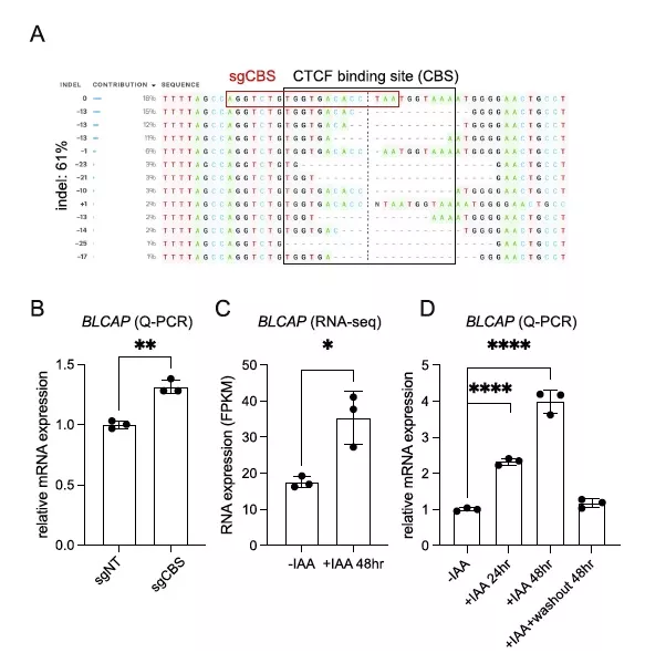 為了進(jìn)一步驗證預(yù)測的假定絕緣子的作用,將慢病毒表達(dá)的引導(dǎo)RNA感染表達(dá)Cas9的SEM細(xì)胞中,然后進(jìn)行抗生素選擇。Sanger基因組測序(Inference of CRISPR edit, ICE)在目標(biāo)人群中檢測到約61%的總indel頻率(圖5A),與非靶向?qū)驅(qū)φ战M(sgNT)相比,導(dǎo)致BLCAP mRNA表達(dá)顯著增加(圖5B)。用IAA處理CTCFAID細(xì)胞24和48小時,然后洗脫IAA進(jìn)行CTCF修復(fù)。通過RNA-seq分析和Q-PCR驗證,驗證急性CTCF蛋白耗竭時BLCAP mRNA的表達(dá)(圖5C)。不出所料,生長素處理24或48 h后CTCF蛋白急性耗竭,BLCAP表達(dá)水平顯著升高。更重要的是,洗脫生長素后,其表達(dá)水平恢復(fù)到親本細(xì)胞的水平(圖5D)。綜上所述,這些數(shù)據(jù)有力地支持了CTCF在BLCAP調(diào)控區(qū)域的占用充當(dāng)了控制BLCAP表達(dá)的功能絕緣體。