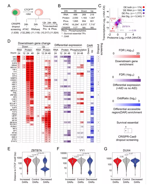 本文開發(fā)了一種多組學(xué)聯(lián)合的方法來定義CTCF共調(diào)控轉(zhuǎn)錄因子,總共鑒定了40個CTCF共同調(diào)控因子,這些TF在急性CTCF耗竭時在mRNA和/或蛋白質(zhì)水平上顯著影響其下游靶基因的表達(dá)(圖6D)。正如預(yù)期的那樣,這40個CTCF共調(diào)控因子中的大多數(shù)也在CTCF介導(dǎo)的DARs中有共同定位,證實了它們與CTCF有著潛在的直接共同調(diào)控作用。