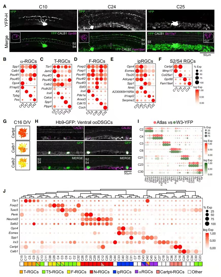 通過(guò)scRNA-seq和形態(tài)學(xué)對(duì)視網(wǎng)膜進(jìn)行雙重驗(yàn)證。結(jié)果發(fā)現(xiàn)aRGC為C41-43、45這4個(gè)cluster(圖 2B);之前的研究?jī)H確定了4個(gè)T-RGC和4個(gè)F-RGC類型,但單細(xì)胞揭示了每個(gè)亞類中的第5種類型(分別為C9和C32;圖 2C和2D);同時(shí)ipRGC也發(fā)現(xiàn)了M1(C33和40)、M2(C31)和 M4(C43)類型的標(biāo)記(圖 2E);ooDSGC中大部分是Cartpt+,通過(guò)Mmp17的表達(dá)確定了N-ooDSGC;C16表達(dá)的Col25a1,是D-和V-ooDSGC的marker。最后CALB1+細(xì)胞是D-ooDSGCs ,CALB2高表達(dá)細(xì)胞是V-ooDSGC(圖 2F-2H)。已知RGC子類與cluster存在部分重合,每種cluster不超過(guò)兩個(gè)子類。子類與cluster重合表達(dá)的基因如圖2J,如:4/5 T-RGCs (Tbr1+)、4/5 F-RGCs (Foxp2+)、5/9 T5-RGCs (Tusc5+)、4/5 ipRGCs(Opn4+)和3/4 aRGC(Spp1+)。另外還鑒定到了新的子類:如8個(gè)表達(dá)轉(zhuǎn)錄因子Neurod2和Satb2的cluster被化為N-RGC等。其余11/45類型未分配到子類,但它們確實(shí)表現(xiàn)出與其他類型的相關(guān)性。