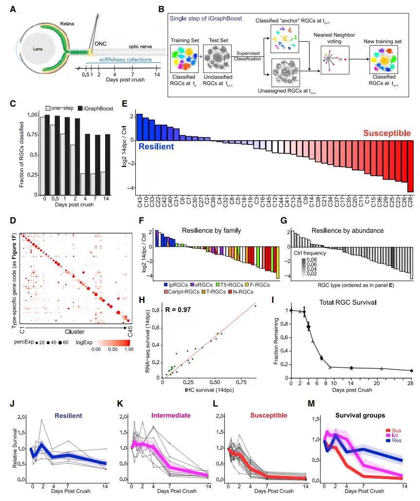 以RGC圖譜為基礎(chǔ),評(píng)估了不同細(xì)胞類型對(duì)ONC的彈性(圖 3A)。在ONC后14天對(duì)~8,500個(gè)RGC進(jìn)行分析,此時(shí)~80% RGC已經(jīng)死亡(圖 3C),該研究使用iGraphBoost對(duì)細(xì)胞進(jìn)行分群(圖 3B),iGraphBoost可以將89%損傷的RGC分配到各個(gè)cluster中(圖 3C)。損傷后第14天所有cluster表達(dá)的marker基因同1F(圖3D)。與對(duì)照相比,將14dpc不同RGC類型的存活率按從高到低排列(圖 3E),不同RGC類型在14dpc時(shí)表現(xiàn)出不同的存活率,范圍從1%到98%不等。比較轉(zhuǎn)錄組測(cè)序和IHC對(duì)細(xì)胞活率的結(jié)果,結(jié)果高度一致(Pearson r = 0.97)(圖 3H)。這些數(shù)據(jù)表明不同RGC對(duì)傷害的不同反應(yīng)。所有ipRGC(Opn4+)都是有彈性的,所有N-RGC類型都是易受影響的(圖 3F)。之前被定性為彈性子類的aRGC中,C42,43具有很高的彈性,但C41,45相對(duì)容易受到影響(圖 3F)。同樣,稀有和豐富的類型都可能具有彈性或脆弱性(圖 3G)。因此,基因表達(dá)或RGC子類都不是判斷細(xì)胞是否是彈性的完美因子。
