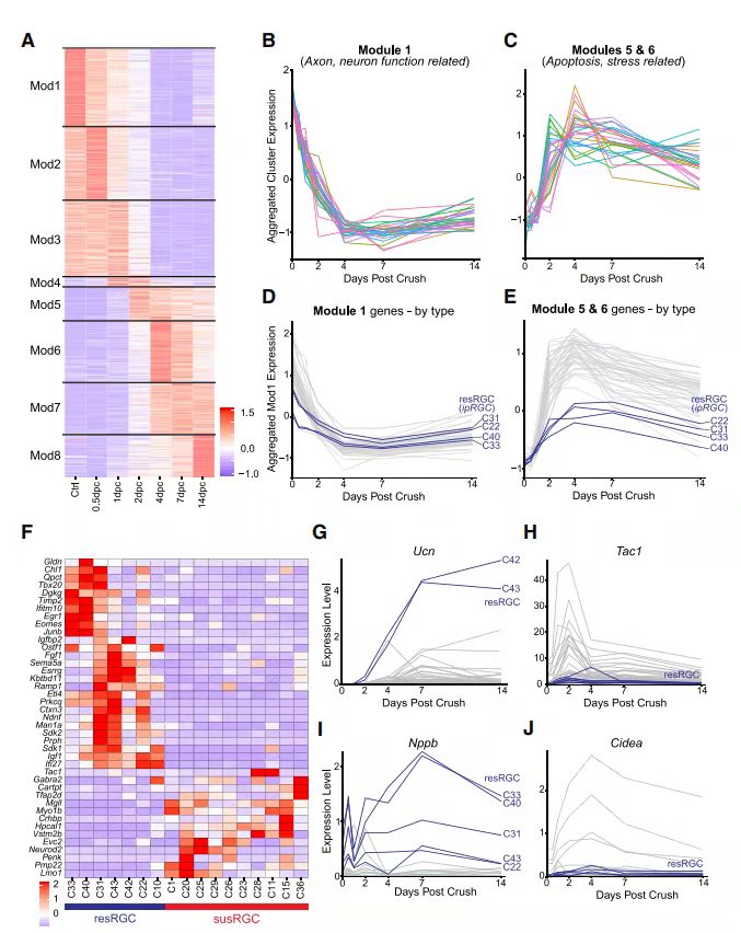 為了研究RGC中激活損傷反應(yīng),對(duì)ONC后的RGC進(jìn)行基因表達(dá)譜分析,確定了771個(gè)在不同類型之間的DE基因,通過(guò)k均值聚類(圖 4A)劃分為8個(gè)模塊(Mod1-8),識(shí)別具有不同時(shí)間動(dòng)態(tài)的基因集,這些基因集富集在不同的GO功能中,例如在0.5dpc開(kāi)始下降的模塊1(Mod1)中的基因富集在健康神經(jīng)元相關(guān)的GO功能中,如動(dòng)作電位、突觸囊泡胞外/內(nèi)吞作用和逆行軸突運(yùn)輸(圖 4B)。相比之下,在Mod5和Mod6中的基因與細(xì)胞凋亡和應(yīng)激途徑相關(guān)(圖 4C)。DE基因幾乎沒(méi)有表現(xiàn)出強(qiáng)烈的類型特異性差異,但ipRGC類型除外,Mod5、6和7中C22、C31、C33和C40中的基因的上調(diào)明顯低于其他類型(圖 4D和4E)。