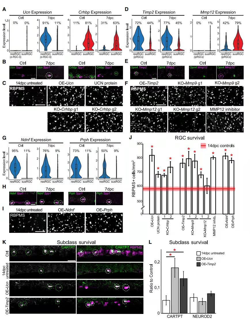 尿皮質(zhì)素(Ucn),它編碼來(lái)自促腎上腺皮質(zhì)激素釋放因子家族的肽;促腎上腺皮質(zhì)激素釋放激素結(jié)合蛋白(Crhbp)。ONC后Ucn僅在aRGC中上調(diào),而Crhbp在ONC前后susRGC中表達(dá)(圖 5A和5B)。過(guò)表達(dá)Ucn,注射Ucn重組蛋白,通過(guò)CRISPR和兩種不同的sgRNA敲除Crhbp,結(jié)果發(fā)現(xiàn)四種方式都顯著增加RGC的存活率(圖 5C和5J)。隨后又驗(yàn)證了幾對(duì)基因的表達(dá)和功能富集情況,結(jié)果與Ucn和Crhbp類似。說(shuō)明可以通過(guò)對(duì)基因的干預(yù)來(lái)保護(hù)部分脆弱的RGC類型。