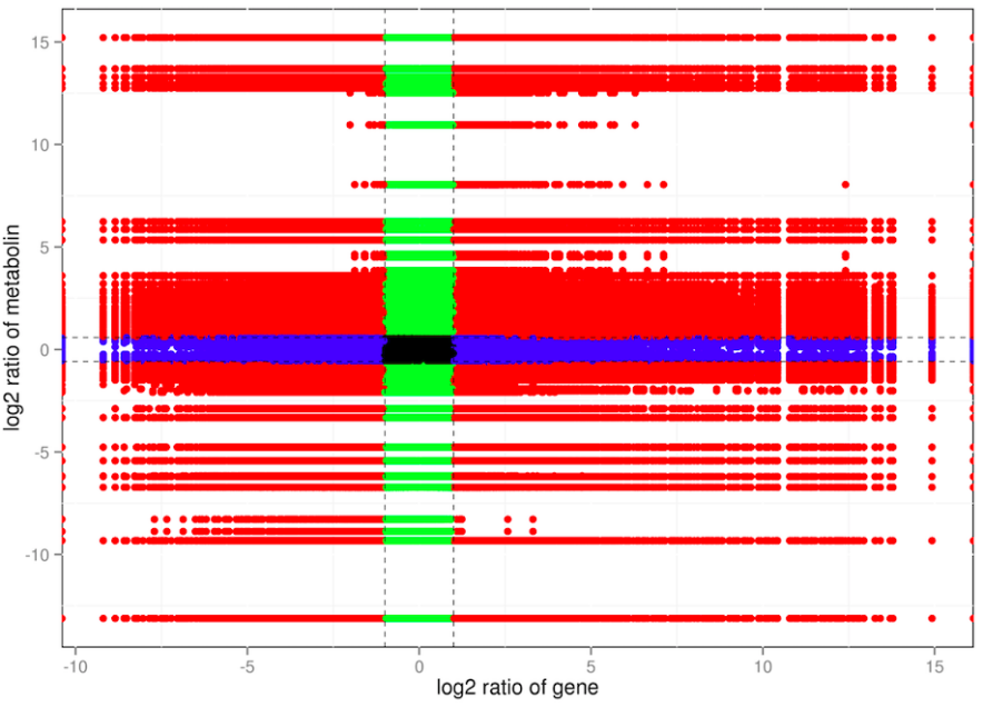 將不同差異分組基于皮爾遜相關性(pearson)方法計算所有基因和代謝物之間的相關性,然后按照相關性系數(shù)(Correlation Coefficient,CC)和相關性的pvalue篩選表達相關性較高的基因和代謝物。并利用九象限圖對于篩選后的基因和代謝物的表達趨勢進行分析,例如基因和代謝物表達趨勢一致或相反,表明基因可能是正向或者負向調控代謝物,或者基因/代謝物表達發(fā)生變化,但是對應的代謝物/基因表達不變,則說明還有其他的調控機制參與到整個代謝通路中。