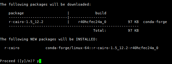 然后嘗試conda install -c conda-forge r-cairo(注意包的名字用小寫(xiě)字母)來(lái)安裝。出來(lái)這個(gè)敲y,一般都能安裝成功。conda安裝R包首先要安裝有conda,然后激活conda環(huán)境,在命令行而不是交互界面去安裝。