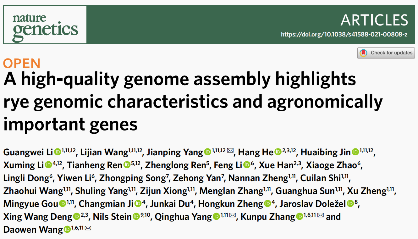 本研究對(duì)我國(guó)栽培的優(yōu)良品種威寧黑麥進(jìn)行了基因組測(cè)序,基因組組裝大小為7.74 Gb,其中93.67%被掛載到7條染色體上,重復(fù)序列占總基因組的90.31%。并基于高質(zhì)量基因組揭示了全基因組基因復(fù)制及其對(duì)淀粉生物合成基因的影響,解析了復(fù)雜儲(chǔ)存蛋白基因座位點(diǎn)、早抽穗性狀的基因表達(dá)特征以及黑麥中與馴化相關(guān)的染色體區(qū)域和基因座。本次研究結(jié)果對(duì)黑麥的基因組特性及其農(nóng)藝性狀調(diào)控基因有了新的認(rèn)識(shí),獲得了對(duì)進(jìn)一步研究黑麥馴化遺傳基礎(chǔ)可能有用的染色體區(qū)域和基因座。威寧黑麥基因組組裝對(duì)于破解黑麥基因組生物學(xué),深化比較谷類基因組學(xué)研究,加速黑麥及相關(guān)谷類作物的遺傳改良具有重要價(jià)值。