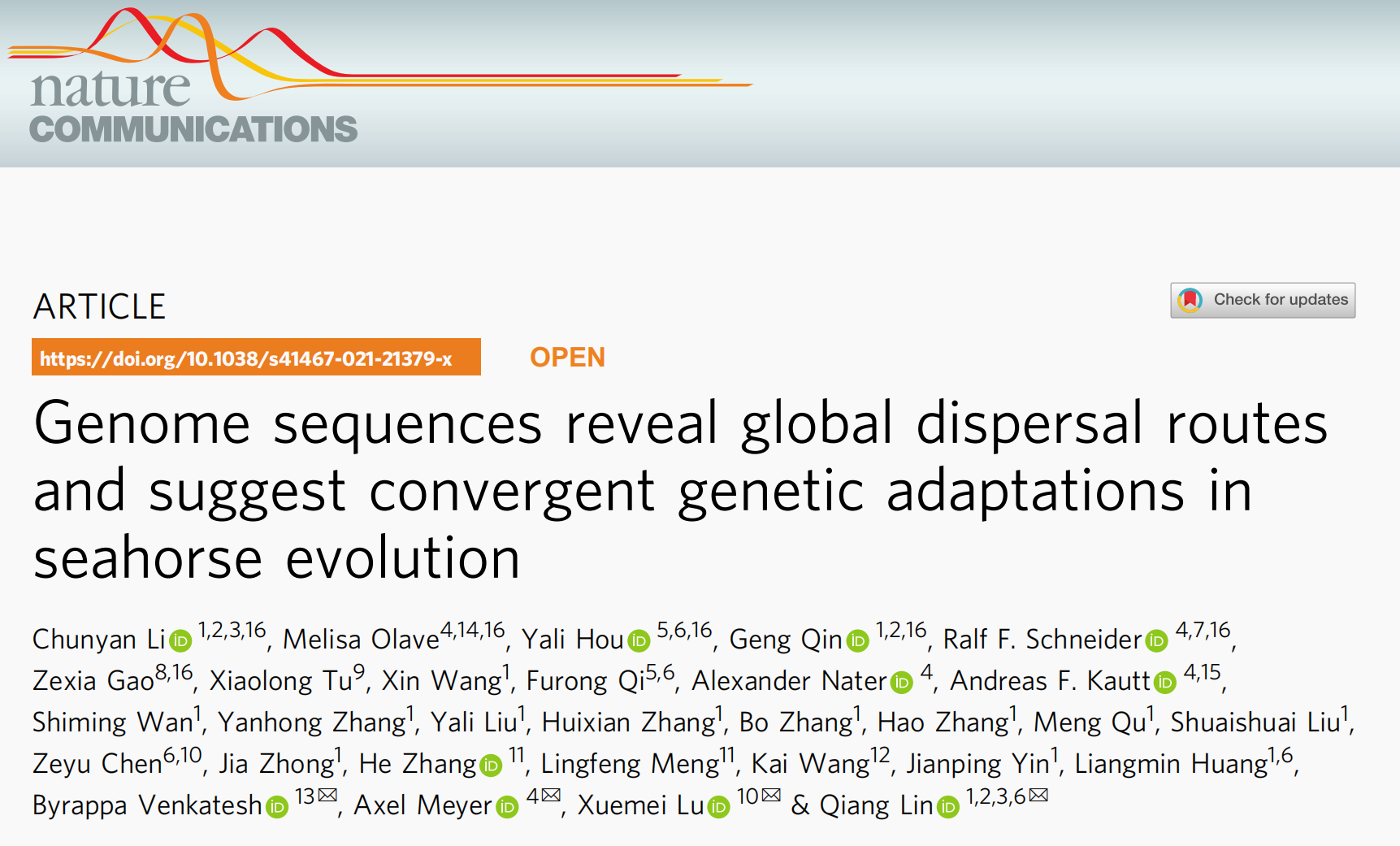 本研究利用PacBio和Hi-C技術(shù)重新組裝了雄性直立海馬的基因組,其組裝大小為420.66 Mb,contig N50=15.5Mb。并通過(guò)包含21個(gè)不同海馬種的358個(gè)海馬標(biāo)本重測(cè)序與進(jìn)化關(guān)系分析,研究了海馬在世界范圍內(nèi)的分布和生物地理格局。研究發(fā)現(xiàn)海馬在晚漸新世進(jìn)化,展示了其隨后的全球定居路線,并表示這種特征與洋流動(dòng)態(tài)變化和古時(shí)期的海道開(kāi)口有關(guān)。此外,反復(fù)出現(xiàn)的“骨刺”適應(yīng)性表型的遺傳基礎(chǔ)與一個(gè)關(guān)鍵發(fā)育基因的獨(dú)立替代有關(guān)。因此,分析表明,通過(guò)洋流漂流可以彌補(bǔ)分散性差的缺陷,并且快速適應(yīng)有利于海馬開(kāi)拓新的棲息地。