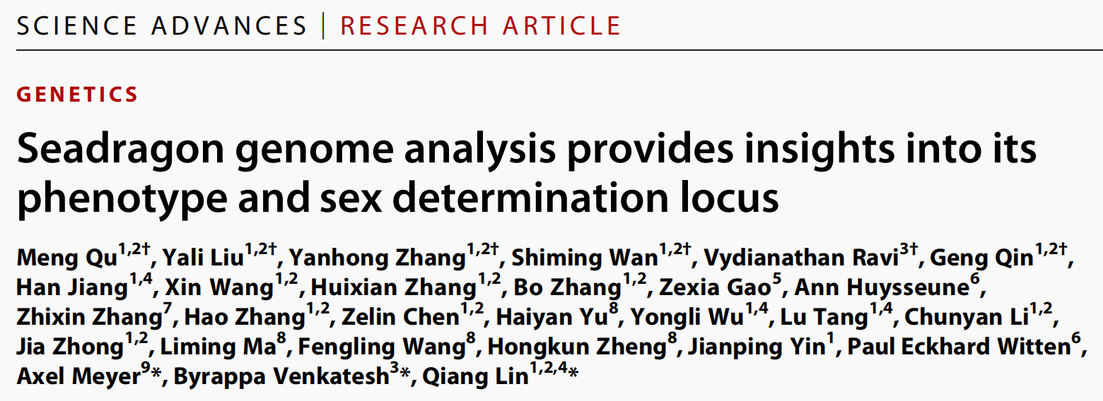 本研究完成雌雄性海龍基因組的破譯,草海龍最終組裝大小為 ~659 Mb(♂)與 ~663 Mb(♀), contig N50分別為10.0 Mb與12.1 Mb。綠海龍分別組裝~637 Mb(♂)與~648 Mb(♀),contig N50分別為18.0Mb與21.0 Mb。通過(guò)系統(tǒng)發(fā)育分析,明確草海龍與綠海龍?jiān)谙到y(tǒng)發(fā)育地位上屬于海龍亞科(Syngnathinae)的姊妹群,并于27.3 百萬(wàn)年前左右發(fā)生分化。進(jìn)一步通過(guò)結(jié)合重測(cè)序分析、轉(zhuǎn)錄分析、比較基因組分析等研究揭示了草海龍適應(yīng)性進(jìn)化產(chǎn)物附葉的快速愈合和再生能力相關(guān)基因,以及海龍科物種性別決定基因的產(chǎn)生和演化歷程,為海洋魚類的環(huán)境適應(yīng)性進(jìn)化研究提供了重要理論依據(jù)。