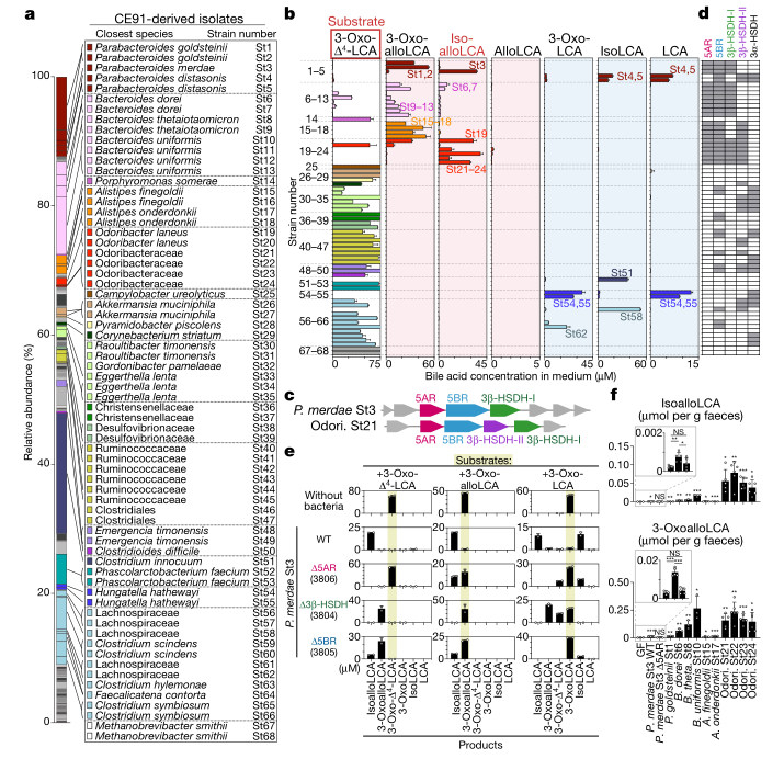 長(zhǎng)期以來(lái),微生物組一直被認(rèn)為是決定老年人健康狀況的關(guān)鍵因素,因?yàn)樗诳刂葡δ?、骨密度、神?jīng)活動(dòng)、免疫力和對(duì)病原體感染的抵抗力方面發(fā)揮著作用。百歲老人對(duì)衰老相關(guān)疾病、慢性炎癥和傳染病的易感性降低。在該研究中,發(fā)現(xiàn)百歲老人有一個(gè)獨(dú)特的腸道微生物組,其中富含能夠產(chǎn)生獨(dú)特的次級(jí)膽汁酸的微生物,包括各種異構(gòu)體的石膽酸(LCA):3-oxo-,allo-,3-oxoallo-和isoallolithocholic acid。在這些膽汁酸中,isoalloLCA的生物合成途徑從未被報(bào)導(dǎo)過(guò)。從一名百歲老人糞便微生物群中篩選出了68株細(xì)菌,在體外和體內(nèi)都鑒定了Odoribacteraceae菌株是產(chǎn)生同種isoalloLCA的有效菌株。此外,還發(fā)現(xiàn)5-羥基類(lèi)固醇脫氫酶(3-α-β-HSDH)和5-羥基類(lèi)固醇脫氫酶(5-β-reductase,5AR)負(fù)責(zé)isoalloLCA的產(chǎn)生。IsoalloLCA對(duì)革蘭氏陽(yáng)性多重耐藥病原菌,包括艱難梭狀芽胞桿菌和屎腸球菌有很強(qiáng)的抗菌活性。這些發(fā)現(xiàn)表明,特定膽汁酸的代謝可能與降低感染病原體的風(fēng)險(xiǎn)有關(guān),從而可能有助于維持腸道內(nèi)環(huán)境的穩(wěn)定。