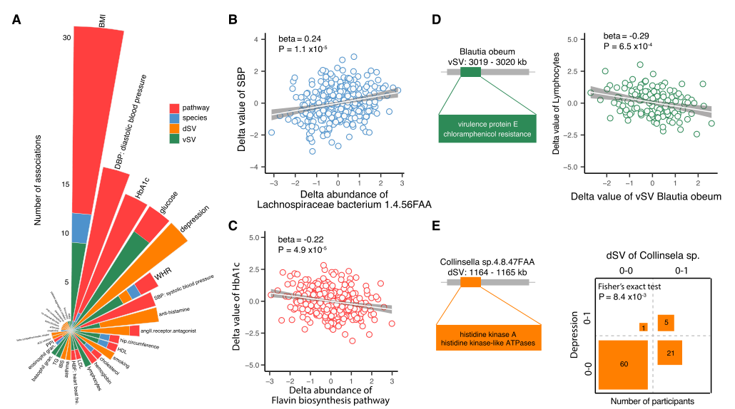 人的腸道中有各種各樣的微生物群落,這些微生物在個(gè)體間表現(xiàn)出很大的變異。該研究通過(guò)對(duì)腸道微生物群、51個(gè)人類(lèi)表型和338個(gè)個(gè)體的1183個(gè)代謝物的血漿水平進(jìn)行4年的跟蹤調(diào)查,描述了微生物的穩(wěn)定性和變異與宿主生理的關(guān)系。利用這些個(gè)體特異性和時(shí)間穩(wěn)定的微生物圖譜,包括細(xì)菌SNPs和結(jié)構(gòu)變異,開(kāi)發(fā)了一種微生物指紋圖譜方法,在對(duì)相隔4年的宏基因組樣本進(jìn)行分類(lèi)時(shí),準(zhǔn)確率高達(dá)85%。將該指紋方法應(yīng)用到獨(dú)立的HMP隊(duì)列中,對(duì)于相隔1年的樣本,準(zhǔn)確率為95%。進(jìn)一步觀察了多種細(xì)菌種類(lèi)的豐度、代謝途徑、結(jié)構(gòu)變異以及菌株替換的時(shí)間變化。報(bào)告了190個(gè)縱向微生物與宿主表型相關(guān),519個(gè)與血漿代謝物相關(guān)。這些關(guān)聯(lián)包含心臟代謝特征、維生素B和尿毒癥毒素。最后,中介效應(yīng)分析表明腸道微生物群可能通過(guò)其代謝產(chǎn)物影響心臟代謝健康。