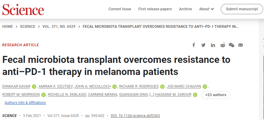 2月:Science:糞菌移植能夠克服黑色素瘤患者對(duì)PD-1免疫療法的耐藥性