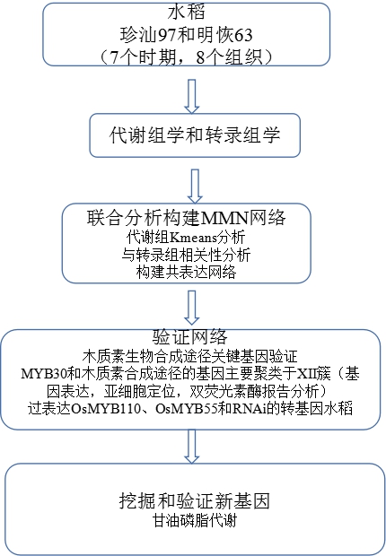 該研究利用代謝組和轉(zhuǎn)錄組聯(lián)合分析,對秈稻品種珍汕97和明恢63整個生命周期不同組織的樣品進(jìn)行測定,結(jié)合轉(zhuǎn)錄和代謝數(shù)據(jù)構(gòu)建了水稻全生育期主要組織器官的代謝調(diào)控網(wǎng)絡(luò)(RMRN)并精準(zhǔn)識別了調(diào)節(jié)關(guān)鍵代謝產(chǎn)物積累的調(diào)控基因,利用已知的轉(zhuǎn)錄因子作為誘餌來篩選木質(zhì)素代謝新的調(diào)控網(wǎng)絡(luò),以及根據(jù)組織特異性無偏見地識別新的甘油磷脂代謝調(diào)控因子。該研究不僅對水稻基礎(chǔ)研究和育種實踐具有重要意義,大數(shù)據(jù)資源促進(jìn)水稻生長調(diào)控、抗性和營養(yǎng)品質(zhì)方面的改良研究。并對其他作物全生育期代謝組學(xué)研究提供借鑒。