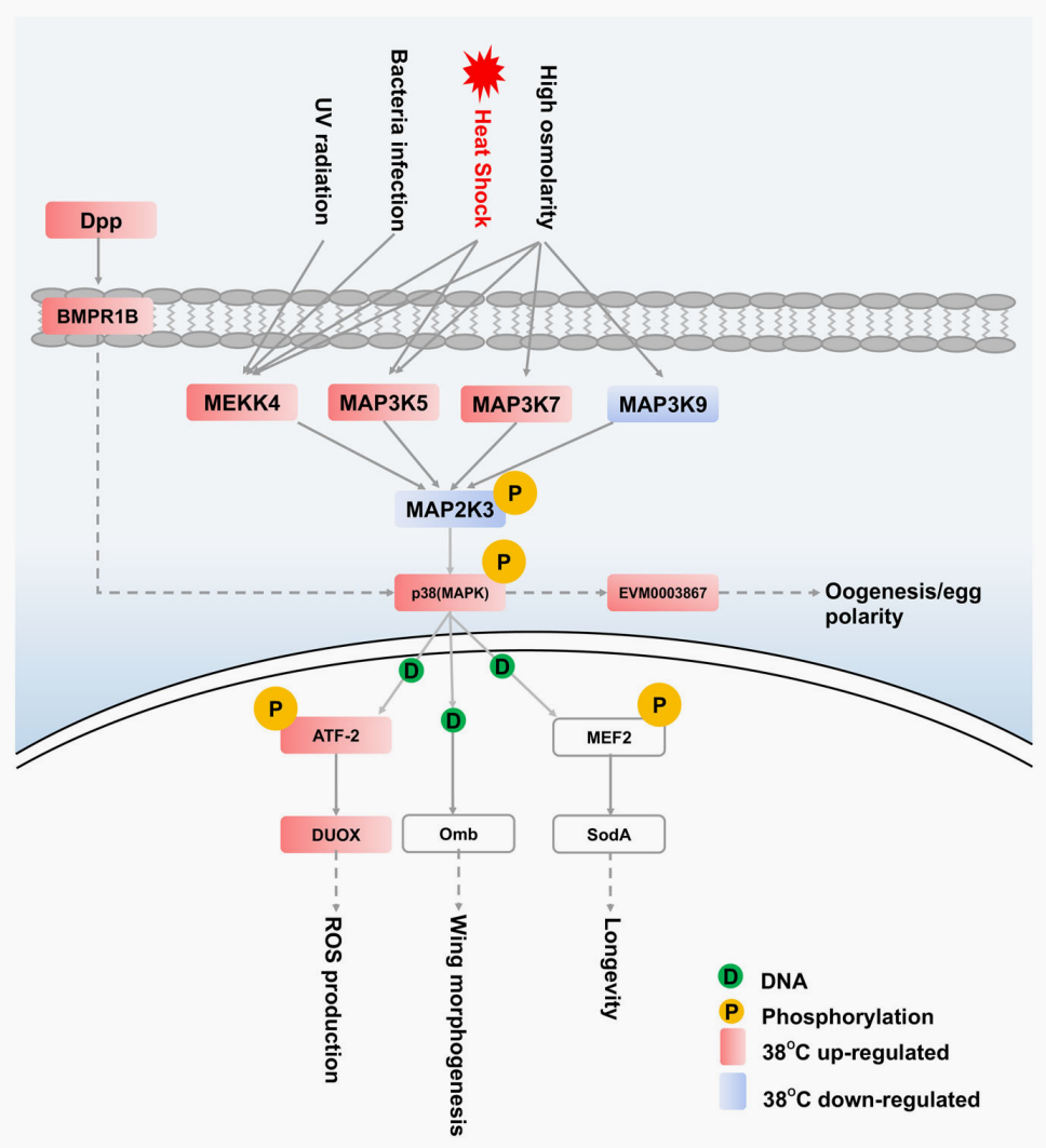 作者進(jìn)一步結(jié)合不同逆境條件處理下的轉(zhuǎn)錄組數(shù)據(jù),分析推測(cè)出橘小實(shí)蠅中熱休克蛋白的相對(duì)穩(wěn)定高表達(dá)是其快速適應(yīng)逆境的內(nèi)在機(jī)制。并發(fā)現(xiàn)在高溫條件下,p38 MAPK通路關(guān)鍵基因表現(xiàn)為應(yīng)激性高表達(dá),表明p38MAPK信號(hào)通路在橘小實(shí)蠅快速適應(yīng)新環(huán)境的過程中發(fā)揮重要作用,并且可能是橘小實(shí)蠅在非生物脅迫下維持穩(wěn)態(tài)機(jī)制的核心。