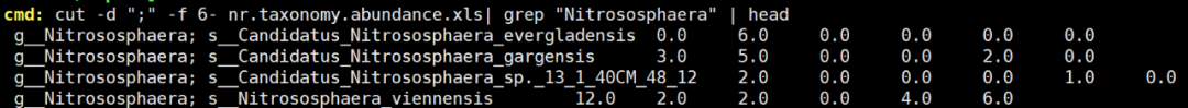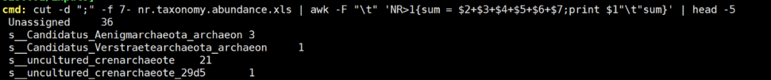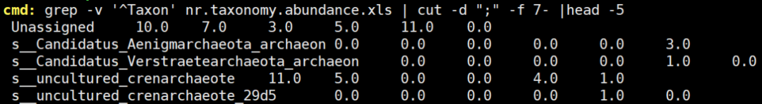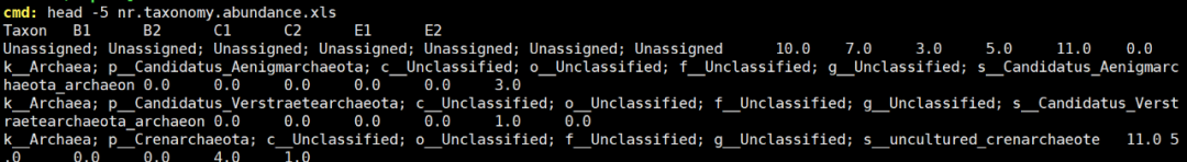 在實際運用過程中,我們通常根據(jù)需要,通過管道符“|”同時使用好幾種生物信息學Linux命令,避免花費大量時間找軟件、寫代碼,有些情況下可以代替Excel等辦公軟件。如下就是一些linux命令的高級使用實例。如下是一個宏基因組的NR注釋結果示例文件:
