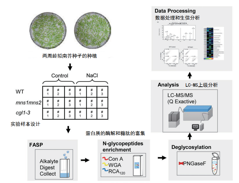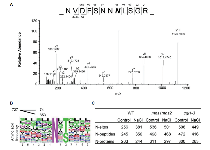 許多證據(jù)表明,植物對鹽脅迫的適應(yīng)性反應(yīng)需要相關(guān)蛋白上加工成熟的N-聚糖參與。然而,關(guān)于在這個過程中起作用的鹽響應(yīng)糖蛋白知之甚少。本研究鑒定了野生型?(WT)擬南芥中的鹽響應(yīng)糖蛋白和兩個N-聚糖成熟缺陷的突變體mns1?mns2和cgl1。通過液相色譜串聯(lián)質(zhì)譜?(LC-MS/MS)?進(jìn)行定量分析,共鑒定出97種豐度變化?>?1.5?的蛋白質(zhì)對抗鹽脅迫。表明N-聚糖對于調(diào)節(jié)應(yīng)激反應(yīng)蛋白水平至關(guān)重要,并且列出了幾種負(fù)責(zé)擬南芥耐鹽脅迫的新型糖蛋白。