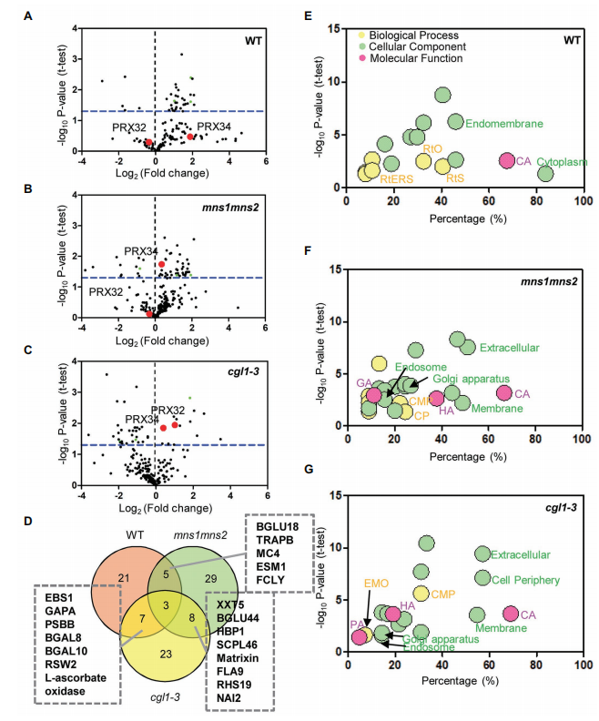 文中進(jìn)一步分析了鹽脅迫下DAG在GO注釋和KEGG代謝途徑中的生物學(xué)功能。在兩個突變體中觀察到更多減少的糖蛋白,尤其是在cgl1-3中(圖2?A–C)。值得注意的是,與?WT?相比,?mns1?mns2和cgl1-3突變體中的水解酶均得到富集(圖2?D–F)。在鹽脅迫下,WT和兩個參與內(nèi)質(zhì)網(wǎng)聚糖鏈轉(zhuǎn)移的突變體中?STT3A(OST亞基)、紫色酸性磷酸酶?2(PAP2)和類胚蛋白10(GLP10)的豐度發(fā)生了變化,這些蛋白分別參與了根系生長和碳代謝(圖2?D)。STT3A在?WT中增加,但在mns1?mns2和cgl1-3中減少;PAP2?在?WT?和mns1mns2中增加,但在cgl1-3中減少,并且GLP10在所有三個樣本中都增加。進(jìn)一步的分子功能分析發(fā)現(xiàn),與WT相比,水解酶活性在mns1?mns2和cgl1-3中富集(圖2?E,G)。WT中鑒定的蛋白質(zhì)的生物學(xué)過程多與應(yīng)激反應(yīng)相關(guān),而來自突變體的大多數(shù)DAG與碳水化合物代謝過程有關(guān)(圖3?G)。這些結(jié)果表明,mns1?mns2和cgl1-3突變體中的鹽響應(yīng)糖蛋白不能正確響應(yīng)壓力,這可能是由于缺乏正確的N-聚糖修飾,導(dǎo)致它們的亞細(xì)胞定位異常。