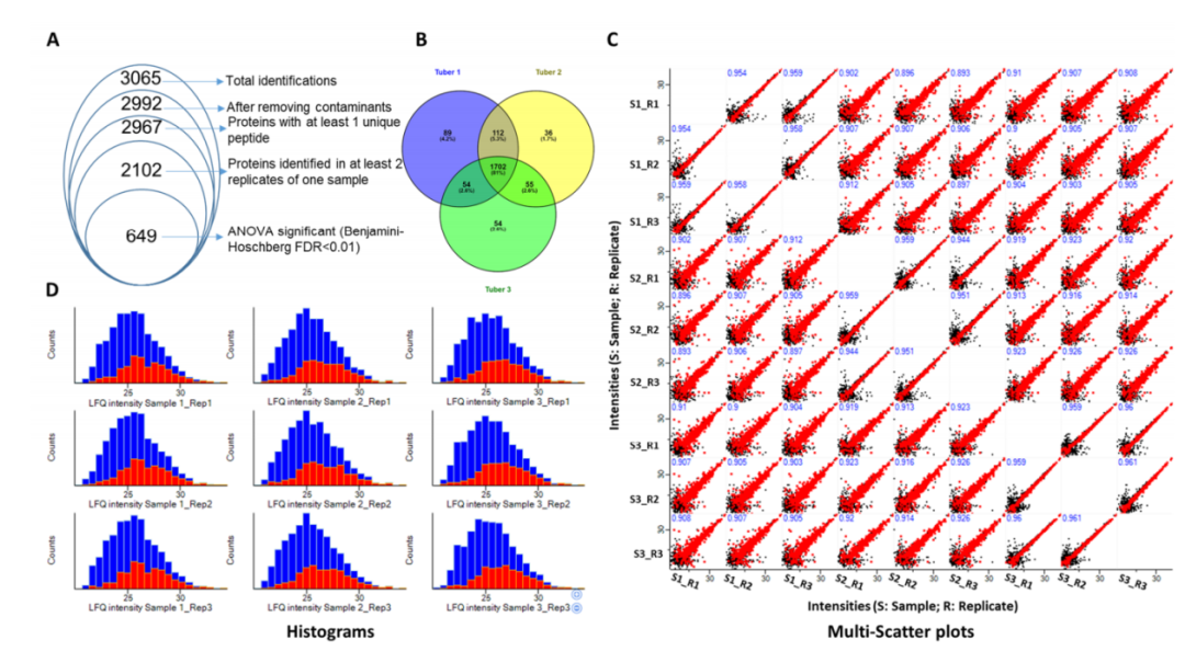 無標(biāo)記定量蛋白質(zhì)組學(xué)方法用于分析三個塊莖樣品之間的差異蛋白質(zhì)豐度。去除污染物和低置信度蛋白后,共鑒定出2967個高置信度蛋白組(圖1?A)。由于使用了三種不同的塊莖樣品,在MS運(yùn)行后預(yù)計(jì)會出現(xiàn)多個缺失值;因此,在三個重復(fù)中的兩個(2102個蛋白質(zhì)組)中可重復(fù)鑒定的蛋白質(zhì)組被選擇并考慮進(jìn)行進(jìn)一步分析(圖1?A)。