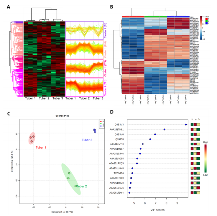 層次聚類分析將差異蛋白分成四個簇,每個簇都有不同的表達(dá)譜(圖2?A)。簇1包含61種蛋白質(zhì),在塊莖3中主要下調(diào),而簇1的891種蛋白質(zhì)主要在塊莖2中上調(diào)。簇3顯示塊莖3中豐度增加的379種蛋白質(zhì),而簇4中的771種蛋白質(zhì)在塊莖?1?中顯示最大豐度。顯示前48種差異調(diào)節(jié)蛋白質(zhì)豐度模式的熱圖位于?(圖2?B)。在這48個DEs中鑒定了多種具有獨(dú)特功能的蛋白質(zhì)。共有19、24和34種DE蛋白受到高度調(diào)節(jié),而塊莖1-3中分別有27、22和14種蛋白質(zhì)降低。結(jié)果表明,塊莖?1?和塊?3?的蛋白質(zhì)含量非常不同,而塊莖2的結(jié)果則參差不齊。此外,偏最小二乘判別分析?(PLS-DA)?將成分?1?中的塊莖1和3分開,占總方差的32.7%,而成分2中的塊莖2與塊莖1和3分開,占總方差的?25.5%總方差的百分比?(圖2?C)。最后確定了有助于PLS-DA圖分離的前15種蛋白質(zhì)(圖2?D)。