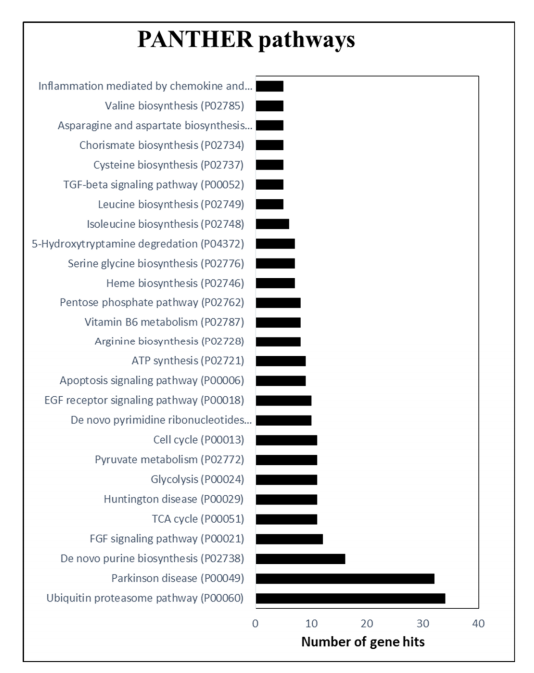 統(tǒng)計(jì)分析后,作者進(jìn)行基于基因本體(GO)的功能分類,在2102種蛋白質(zhì)中,PANTHER?19.0?針對Helianthus?annus數(shù)據(jù)庫檢測到2044種蛋白質(zhì)。接下來,進(jìn)行?PANTHER?通路分析以對蛋白質(zhì)通路進(jìn)行分類,發(fā)現(xiàn)了大多數(shù)蛋白質(zhì)歸因于泛素蛋白體和核苷酸(嘌呤)生物合成途徑,其次是TCA循環(huán)、糖酵解、丙酮酸代謝、細(xì)胞周期和嘧啶核糖核苷酸途徑。
