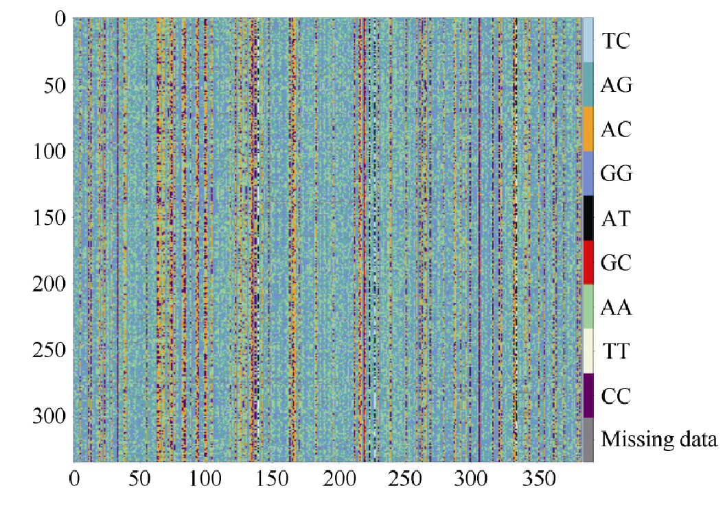 篩選適宜的核心標(biāo)記位點,并將其用合適的形式展現(xiàn)出來至關(guān)重要。利用篩選得到的SNP標(biāo)記進(jìn)行品種材料的鑒定,并構(gòu)建DNA指紋圖譜。例如,玉米DNA指紋圖譜構(gòu)建研究中,利用384個?SNP?標(biāo)記組合構(gòu)建了?335?個玉米雜交種的基因型指紋圖譜,?該圖顯示每個品種的基因型組合均不同,?即?384?個?SNP?位點能夠有效區(qū)分所測試的雜交種。