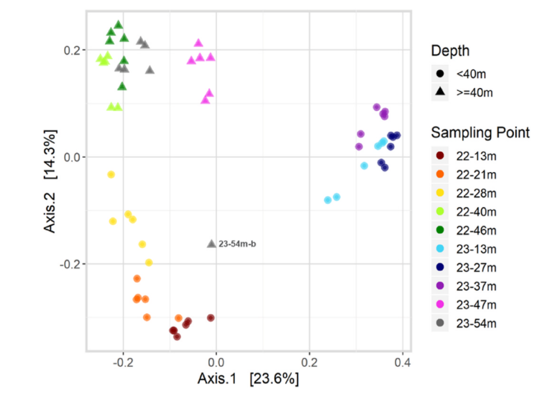 地下水質量對飲用水生產(chǎn)至關重要,但地下水資源正日益受到農(nóng)藥污染的威脅。由于殺蟲劑經(jīng)常出現(xiàn)在微型污染地濃度下,它們對微生物來說是沒有吸引力的碳源,通常會頑固地存在。探索用于飲用水生產(chǎn)的含水層中的微生物群落,是了解地下水中微污染物命運的重要第一步。在這項研究中,調查了用于飲用水生產(chǎn)的含水層中地下水地球化學、殺蟲劑脅迫和微生物群落之間的相互作用。首先,于荷蘭的兩口地下水監(jiān)測井采樣,同時在2014年、2015年和2016年進行了采樣,并且在兩口井中,從13到54?m的五個離散深度對水進行了采樣。為了研究上述科學問題,使用16S?rRNA基因測序和qPCR分析地球化學參數(shù)、農(nóng)藥濃度和微生物群落組成,其中,地下水地球化學在整個研究期間是穩(wěn)定的,農(nóng)藥在低濃度(μg?L-1范圍)下分布不均勻。通過計算Alpha多樣性指數(shù)PD?whole?tree,發(fā)現(xiàn)各個采樣點間的數(shù)據(jù)相似,但是隨著采樣點深度加深而變大。來自同一口井和深度的樣品緊密地組合在一起,這意味著微生物群落在時間上是穩(wěn)定的(圖2),同時,所有的樣品形成三組,第一組:根據(jù)深度(來自兩口井的大于40米的樣本歸為一組);第二組和第三組:井(來自小于40米的樣本分成兩個不同的組–每口井一個)分開。地球化學參數(shù)和較小程度的農(nóng)藥污染對微生物群落產(chǎn)生了選擇壓力,樣品中的微生物群落尤其受到DOC、硝酸鹽、鐵(II)和硫酸鹽豐度的影響。兩口井中的微生物群落在較深的含水層中顯示出相似的組成,在那里抽水會導致水平流動。這項研究提供了對塑造微生物群落組成的地下水參數(shù)的深入了解。這些信息有助于未來實施修復技術,以保證安全的飲用水生產(chǎn)。