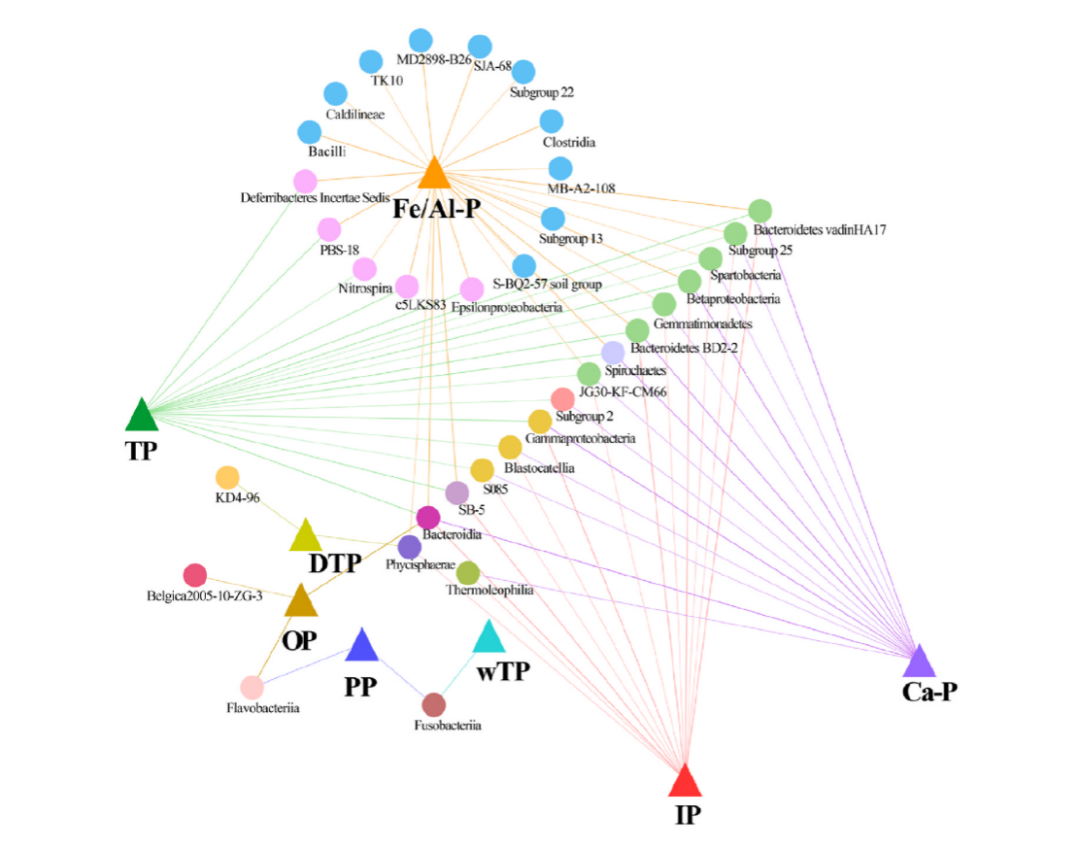 圖4?網(wǎng)絡分析顯示35個細菌群落在級別上(用圓圈表示)和8個不同的磷形式(用三角形表示)之間有很強的相關性