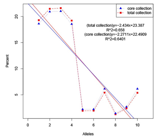 構(gòu)建好的核心種質(zhì)采用何種方法去評(píng)估核心樣品對(duì)整個(gè)種質(zhì)資源多樣性的代表性同樣是核心種質(zhì)研究中的重點(diǎn)。目前,大多數(shù)研究者結(jié)合不同的方法對(duì)核心種質(zhì)進(jìn)行評(píng)估驗(yàn)證,通過對(duì)原始種質(zhì)材料和篩選的核心種質(zhì)材料進(jìn)行主成分分析,評(píng)估種質(zhì)篩選的準(zhǔn)確性,原則上,基于核心種質(zhì)繪制的主成分圖和所有材料的分布圖趨勢(shì)吻合,就能說明篩選結(jié)果的合理性;計(jì)算常規(guī)的遺傳多樣性指標(biāo):觀測(cè)雜合度(Observed?heterozygosity)、期望雜合度(Expected?heterozygosity)、Nei遺傳多樣性(Nei?diversity?index)、香濃維納多樣性指數(shù)(Shanon-Wiener?index)、多態(tài)性信息含量(PIC),對(duì)原始種質(zhì)材料以及篩選的核心種質(zhì)的遺傳多樣性進(jìn)行評(píng)價(jià);另外還包括等位基因評(píng)價(jià)和表型評(píng)價(jià)。