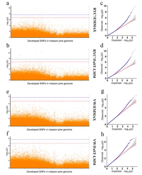 主要內(nèi)容:在本研究中,采用SLAF-seq技術(shù)對(duì)從中國(guó)廣東收集的149份馬尾松(Pinus?massoniana)材料進(jìn)行測(cè)序,從599,164個(gè)多態(tài)性SLAF標(biāo)簽中鑒定了471,660個(gè)SNP標(biāo)記。群體結(jié)構(gòu)分析表明,149份馬尾松不能劃分成明顯的亞種群。使用遺傳距離和種群結(jié)構(gòu)來選擇核心種質(zhì),篩選出包含29個(gè)材料的核心種質(zhì),分別與樹脂產(chǎn)量和木材體積相關(guān)。對(duì)122份馬尾松材料進(jìn)行關(guān)聯(lián)分析,包括不同高度(HT)、胸徑(DBH)、樹脂質(zhì)量(RW)、木材體積(VW)和樹脂產(chǎn)率(RYC),使用mrMLM、FASTmrMLM、FASTmrEMMA和ISIS?EM-BLASSO檢測(cè)到大量的SNP與性狀HT、DBH、RW和RYC顯著相關(guān)。馬尾松核心種質(zhì)為未來的改良育種提供寶貴的資源。