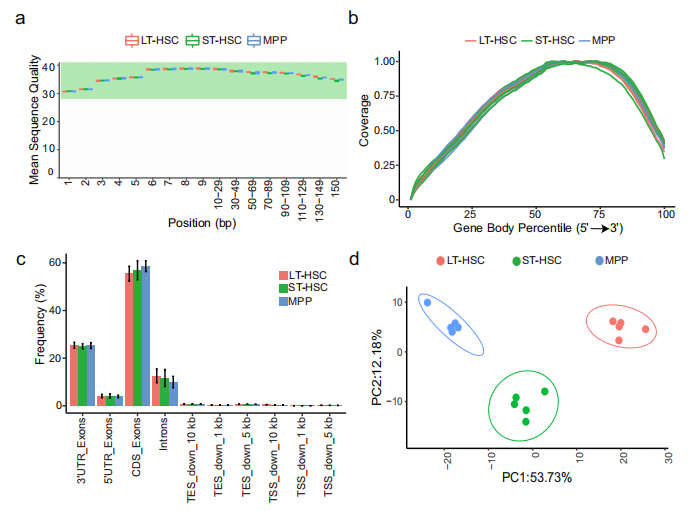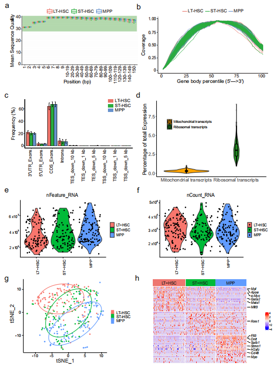 樣本制備:8-9周的雌性成年C57BL/6 J 小鼠,從股骨和脛骨中分離骨髓細(xì)胞。首先使用小鼠造血干細(xì)胞分離試劑盒富集造血干細(xì)胞和祖細(xì)胞(HSPC)。長(zhǎng)期(LT)和短期(ST)造血干細(xì)胞(HSC)和多能祖細(xì)胞(MPP)根據(jù)其表面標(biāo)志物進(jìn)行分選。對(duì)于單細(xì)胞RNA測(cè)序(scRNA-seq),將細(xì)胞單獨(dú)分選到含有裂解緩沖液的8條PCR管中。同時(shí)對(duì)于批量RNA-seq,分選100個(gè)細(xì)胞(P100)到一個(gè)PCR管中作為生物學(xué)重復(fù)。
