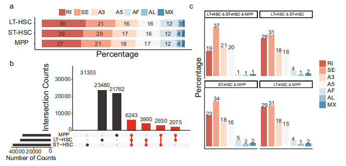 轉(zhuǎn)錄和轉(zhuǎn)錄后的調(diào)控在平衡造血干細(xì)胞的結(jié)構(gòu)性和低水平周轉(zhuǎn)、下游分化和造血重建方面都是關(guān)鍵。在多細(xì)胞生物中,可變剪接是一種關(guān)鍵的轉(zhuǎn)錄后調(diào)控機(jī)制,可以擴(kuò)大轉(zhuǎn)錄本的多樣性。越來(lái)越多的研究表明,在造血過(guò)程中,可變剪接模式是必不可少的。例如,在血液祖細(xì)胞或巨核細(xì)胞和紅細(xì)胞譜系中鑒定到的特異性可變剪接事件。研究發(fā)現(xiàn),關(guān)鍵造血調(diào)節(jié)因子(如HMGA2)的可變剪接模式影響了造血干細(xì)胞的分子鑒定。此外,異常AS是包括白血病等各種癌癥的標(biāo)志物。