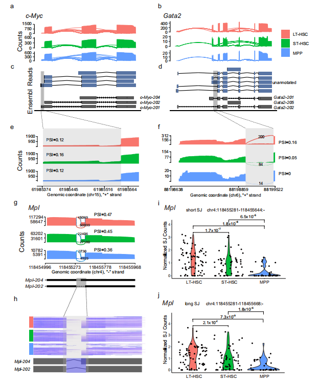 為了進(jìn)一步確認(rèn)長(zhǎng)讀長(zhǎng)在識(shí)別可變剪接異構(gòu)體方面的優(yōu)勢(shì),使用納米孔和PacBio測(cè)序數(shù)據(jù)對(duì)三種細(xì)胞類型中已知的LT-HSC的標(biāo)志物c-Myc和Gata2(圖2h)的轉(zhuǎn)錄本進(jìn)行了可視化。接下來(lái)篩選了所有映射到基因c-Myc和Gata2及其注釋的轉(zhuǎn)錄本上的reads。發(fā)現(xiàn)2915個(gè)reads覆蓋到了c-Myc,且LT-HSC的reads數(shù)*多(圖6a)。在納米孔和PacBio測(cè)序數(shù)據(jù)中可視化了全長(zhǎng)轉(zhuǎn)錄本的reads,發(fā)現(xiàn)所有注釋的亞型都能被鑒定識(shí)別(圖6c)。在c-Myc第一個(gè)外顯子中發(fā)現(xiàn)了一個(gè)5 ‘的可變剪接起始位點(diǎn)。使用短讀長(zhǎng)測(cè)序數(shù)據(jù)來(lái)定量該基因座的剪接百分比(PSI),發(fā)現(xiàn)較長(zhǎng)的異構(gòu)體在所有三種細(xì)胞類型中具有相似的 PSI(剪接百分比),ST-HSC中包含第一個(gè)外顯子的較長(zhǎng)異構(gòu)體的reads占比比較高(圖6 e)。對(duì)于Gata2來(lái)說(shuō),發(fā)現(xiàn)覆蓋有595個(gè)reads,在LT-HSC中比其他兩種細(xì)胞類型多了近20倍的reads數(shù)(圖6b)。通過(guò)對(duì)比全長(zhǎng)reads和注釋的轉(zhuǎn)錄本,發(fā)現(xiàn)在LT-HSC中Ensembl的轉(zhuǎn)錄本中有一個(gè)未注釋的內(nèi)含子保留(圖6d)。隨后利用短讀長(zhǎng)測(cè)序數(shù)據(jù)驗(yàn)證驗(yàn)證了這種內(nèi)含子保留并定量這個(gè)內(nèi)含子的PSI值,發(fā)現(xiàn)該內(nèi)含子在LT-HSC中PSI值*高(圖6f)。接下來(lái)展示將長(zhǎng)讀長(zhǎng)測(cè)序與單細(xì)胞RNA-seq結(jié)合的數(shù)據(jù)示例,從長(zhǎng)讀長(zhǎng)測(cè)序數(shù)據(jù)中鑒定到了一個(gè)在Mpl中具有24 bp可變剪接區(qū)域的可5’剪接位點(diǎn)(A5)。基于Smart-seq2的測(cè)序數(shù)據(jù)發(fā)現(xiàn)這個(gè)剪接事件在不同細(xì)胞類型中是差異的,其PSI值從LT-HSC,ST-HSC到MPP是依次遞減的(圖6g-j)。使用Smart-seq2數(shù)據(jù)可以觀察到單個(gè)細(xì)胞間的異質(zhì)性(圖6h),在造血過(guò)程中,所涉及的長(zhǎng)和短剪接位點(diǎn)(SJ)是被顯著下調(diào)的(圖6i,j)。這些結(jié)果表明,整合短讀長(zhǎng)和長(zhǎng)讀長(zhǎng)測(cè)序有助于識(shí)別差異表達(dá)的異構(gòu)體。