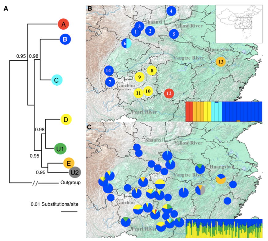 此外,2018年發(fā)表在Current Biology(IF = 10.814)的中國(guó)大鯢研究中,研究人員收集了70個(gè)野生地采集的1034個(gè)個(gè)體,通過(guò)SLAF-seq對(duì)中國(guó)大鯢的分類進(jìn)行研究。基于23,159個(gè)SNPs位點(diǎn)和mtDNA的野生采集個(gè)體的遺傳多樣性分析顯示:中國(guó)大鯢至少具有5個(gè)明顯的分群(圖3)。此外還有一些未被鑒定的種(圖3:U1,U2)。譜系A(chǔ)-E,在4.71-10.25Mya間開(kāi)始分化,并與河流排水相關(guān)?;谵r(nóng)場(chǎng)育種的中國(guó)大鯢個(gè)體的mtDNA和微衛(wèi)星序列的遺傳多樣性分析顯示其具有廣泛的遺傳混合,特別是,漸滲種類B來(lái)自陜西黃河流域。通過(guò)農(nóng)業(yè)混種導(dǎo)致了分化于四百萬(wàn)年前的中國(guó)大鯢發(fā)生了雜交,這種雜交方式不足為奇,另有研究報(bào)道過(guò)在日本本土,中國(guó)大鯢的引種和日本大鯢發(fā)生了雜交。